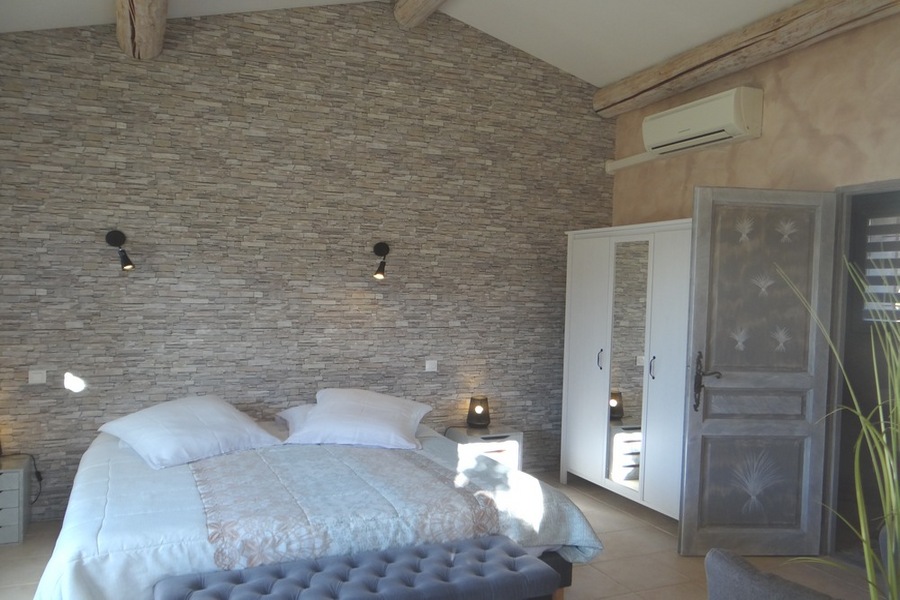 Une chambre claire et raffinée avec plafond cathédrale, belles poutres lazurées, mur en pierres de Gordes